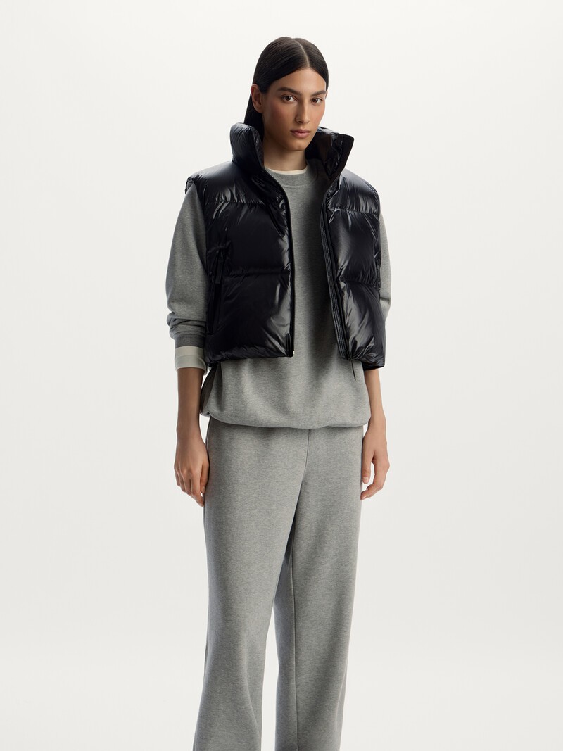 Объемный укороченный и плотно набитый пухом жилет из тонкой шуршащей ткани, блестящей благодаря особой обработке. Широкий воротник-стойка, ветрозащитная планка — модель получилась не просто акцентной, но и функциональной. У прочного материала есть легкий WR для защиты от несильного дождя. Застегивается на прорезиненную молнию. Индекс Fill Power — 750, максимально высокий для натурального утиного пуха. Сделано в Китае.