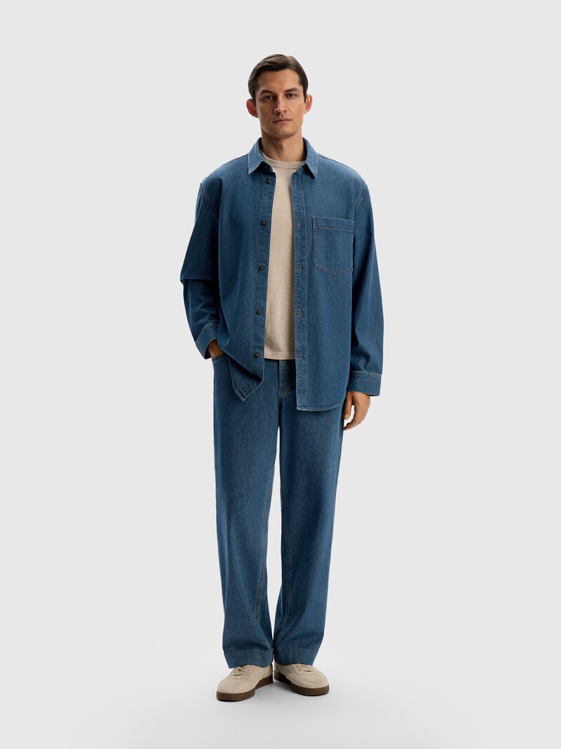 Легкие длинные джинсы со средней посадкой — комфортная база для теплых дней. Мы выбрали для них синий дышащий деним плотностью 8 Oz, а пояс частично сделали эластичным. Удобная застежка на молнию, классическая длина и деликатные эффекты варки, чтобы джинсы легко было сочетать с любыми вещами. Сделано в Китае.