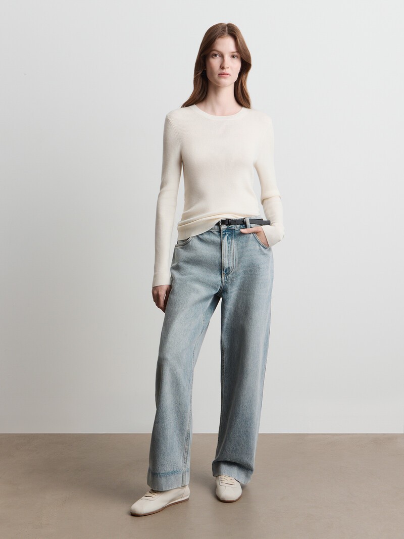 Эти прямые джинсы слегка укорочены и имеют низкую посадку. Боковой шов слегка изогнут, что придает джинсам силуэт, напоминающий подкову, а благодаря широкой подгибке снизу они выглядят еще интереснее. Выполнены из слегка подкрашенного голубого денима плотностью 13,5 Oz, что придает джинсам винтажный вид. Патч сделан из натуральной кожи. Застегиваются на молнию. Сделано в Китае.