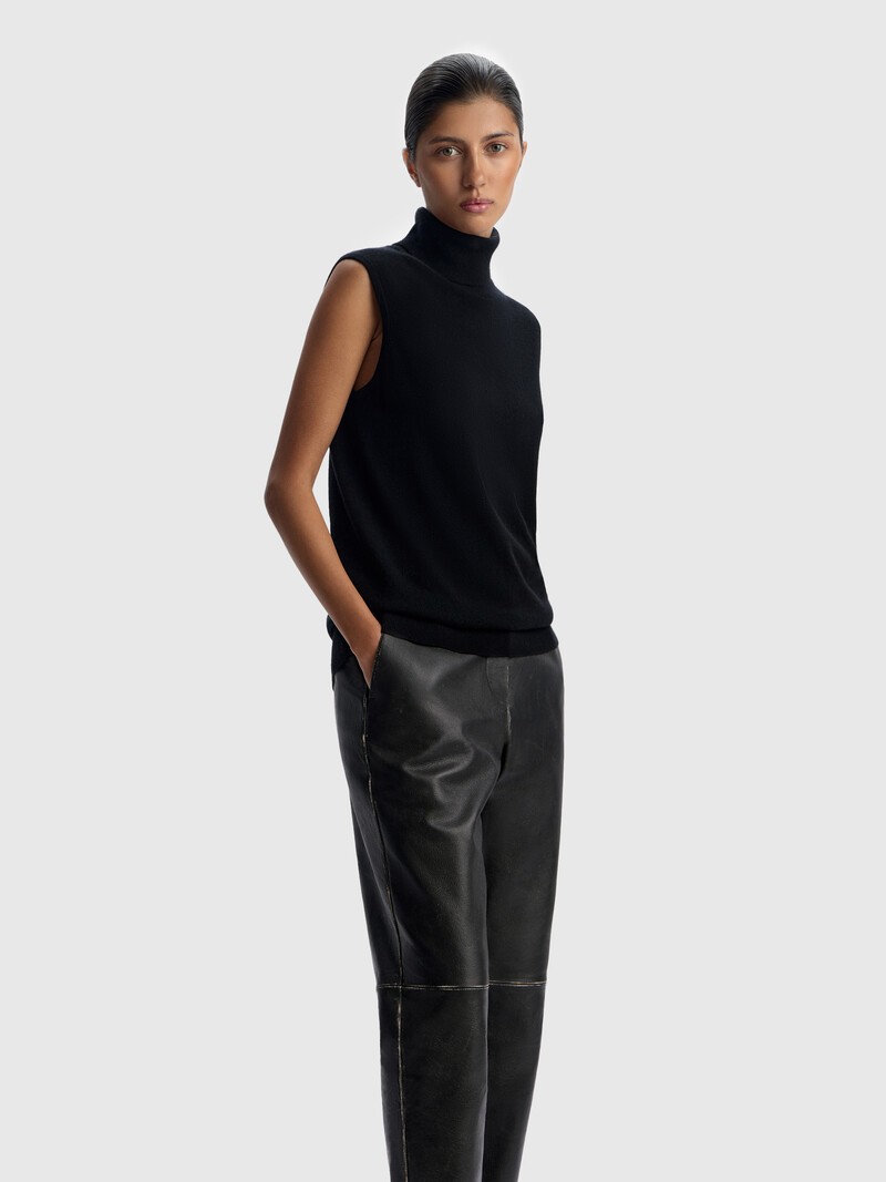 Аккуратный джемпер без рукавов — для уютных образов в прохладные дни: высокий воротник, резинка по низу для комфортной посадки, классическая длина. Благодаря полуприлегающему силуэту эту модель можно надеть под пиджак или кардиган. Материал — тонкая, нежная нить на основе мериносовой шерсти с добавлением кашемира. Такой трикотаж получается пластичным, мягко согревает и отлично дышит. У этого изделия низкая пиллингуемость. При правильном уходе первые пилли могут появиться на нем в среднем через 10 носок. При трении о шероховатые поверхности пушинки кашемира могут скатываться. Чтобы удалить пилли, пользуйтесь специальной машинкой. Сделано в Китае.