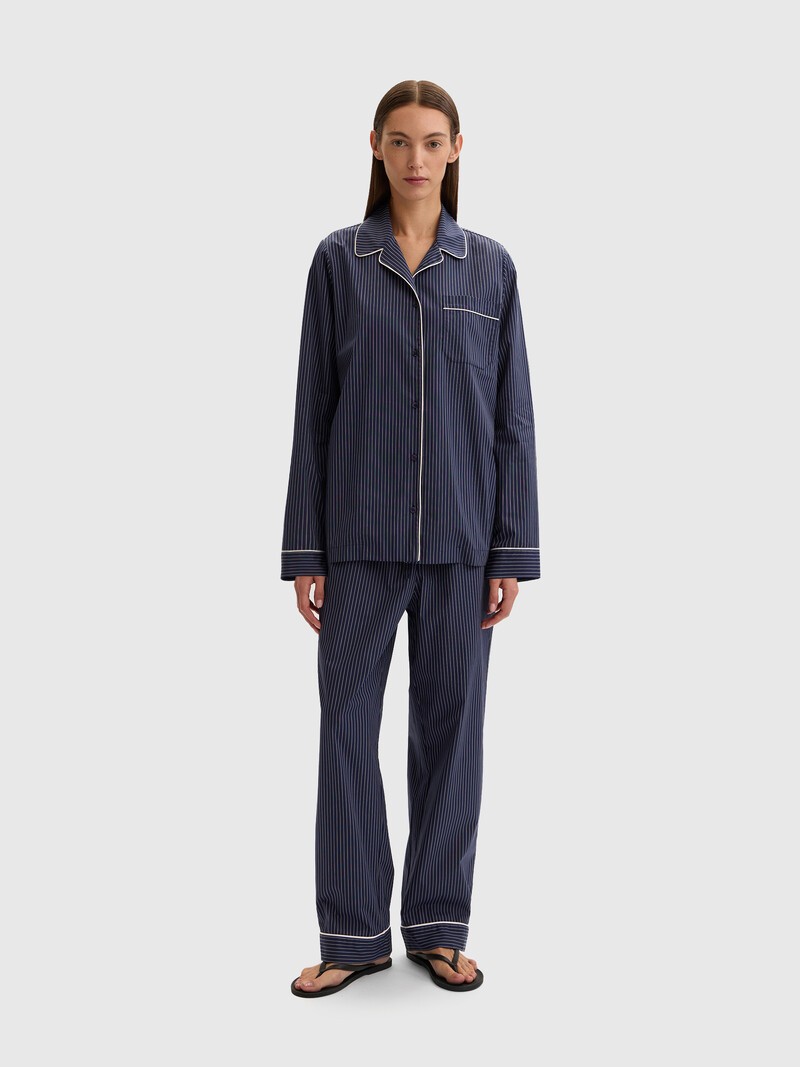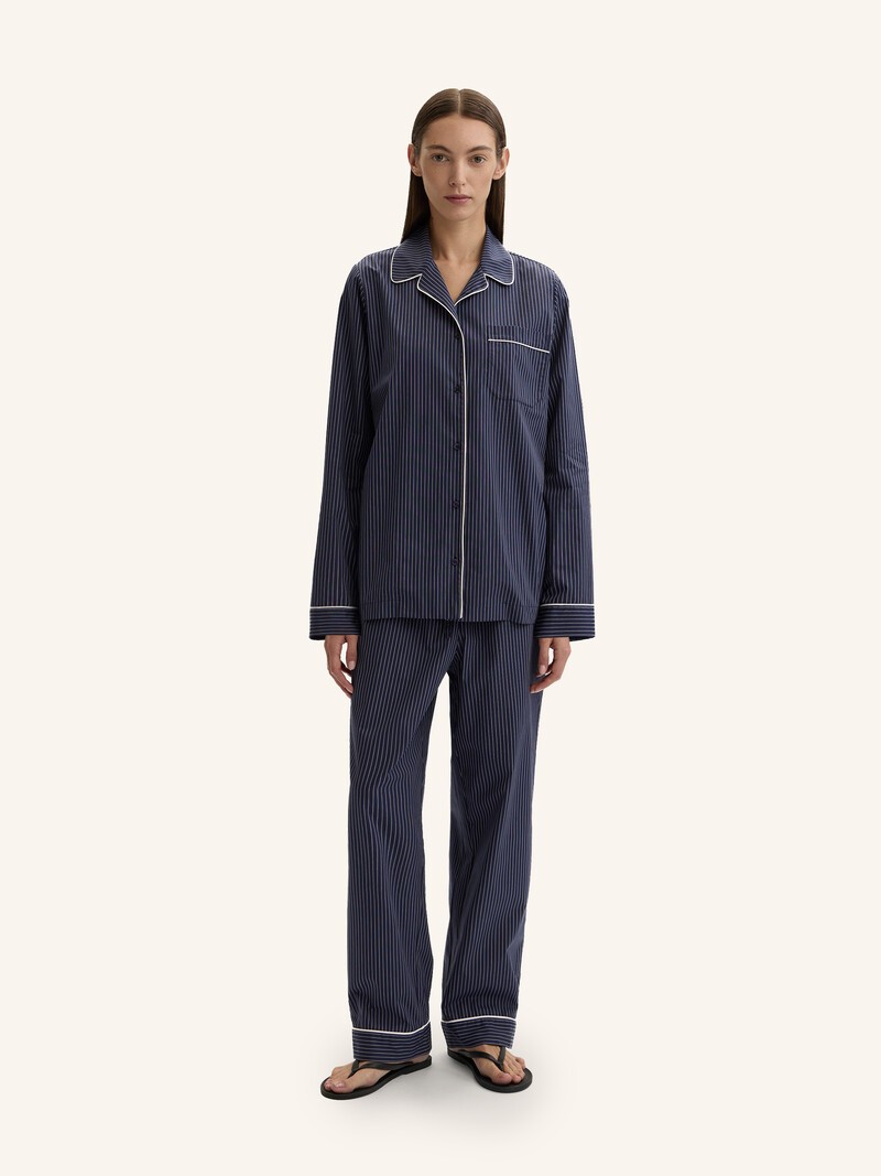 Хлопковая пижама в деликатную серую полоску — для приятных снов и комфортного отдыха дома или в путешествиях. Свободная рубашка с отложным воротником и нагрудным кармашком и прямые брюки на эластичном поясе с карманами по бокам выполнены из гладкого, плотного, легкого и приятного к телу поплина от нашего испанского поставщика и отделаны по краям тонким кантом.