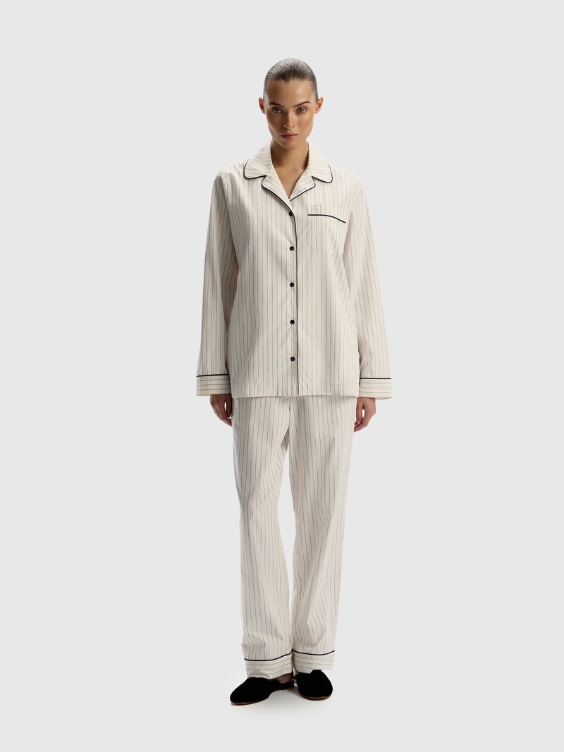 Хлопковая пижама в деликатную серую полоску — для приятных снов и комфортного отдыха дома или в путешествиях. Свободная рубашка с отложным воротником и нагрудным кармашком и прямые брюки на эластичном поясе с карманами по бокам выполнены из гладкого, плотного, легкого и приятного к телу поплина от нашего испанского поставщика и отделаны по краям тонким кантом.