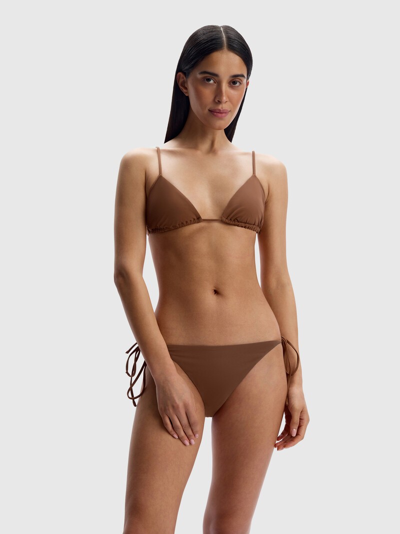 Купальный топ с треугольными мягкими чашками, длинными завязками и металлическим крючком. Универсальный оттенок легко комбинировать с любыми плавками, а в сочетании с шортами мини получится комфортный летний комплект. Лиф выполнен из гладкого плотного материала, который хорошо держит форму и не теряет со временем яркости и эластичности, и дополнен подкладкой из более легкой и тонкой ткани. Продается в водонепроницаемой косметичке из рогожки с застежкой на кнопки. Рекомендуем примерить топ перед покупкой, чтобы правильно подобрать размер чашки.