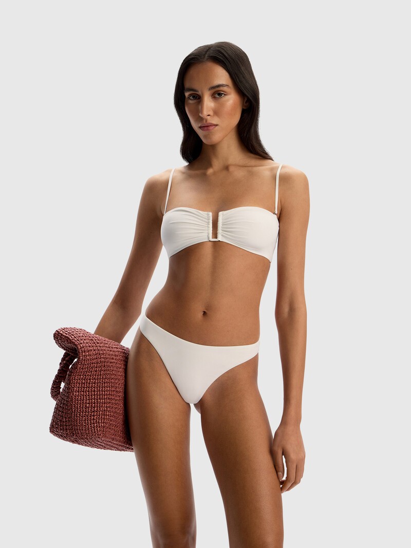 Лаконичный лиф-бандо с вертикальными косточками в боковых швах. Выполнен из гладкого плотного материала, который хорошо держит форму и не теряет со временем яркости и эластичности. Чашки без уплотнителя собраны на металлическую скобу, а эластичная тесьма над грудью обеспечивает плотное прилегание. Застегивается на пластиковый замок. На подкладке из тонкой и легкой ткани. Продается в водонепроницаемой косметичке из рогожки с застежкой на кнопки.