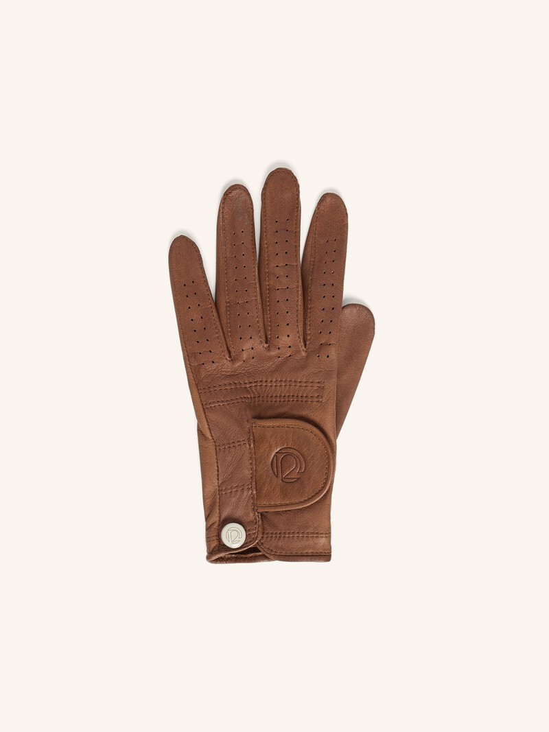 Перчатка для гольфа из нежной коричневой кожи с перфорацией — для тех, кто хочет выделяться на поле не только игрой. Она сидит на руке как влитая благодаря продуманному крою, отсутствию подкладки и застежке велкро. Кнопка с логотипом бренда отстегивается — ее можно использовать, чтобы отметить положение мяча на поле. Продается в коробке в комплекте с пыльником. Золотой статус LWG означает, что фабрика полностью отвечает требованиям к экологической безопасности процессов и химикатов, имеет все необходимые очистные сооружения и заботится о здоровье сотрудников.