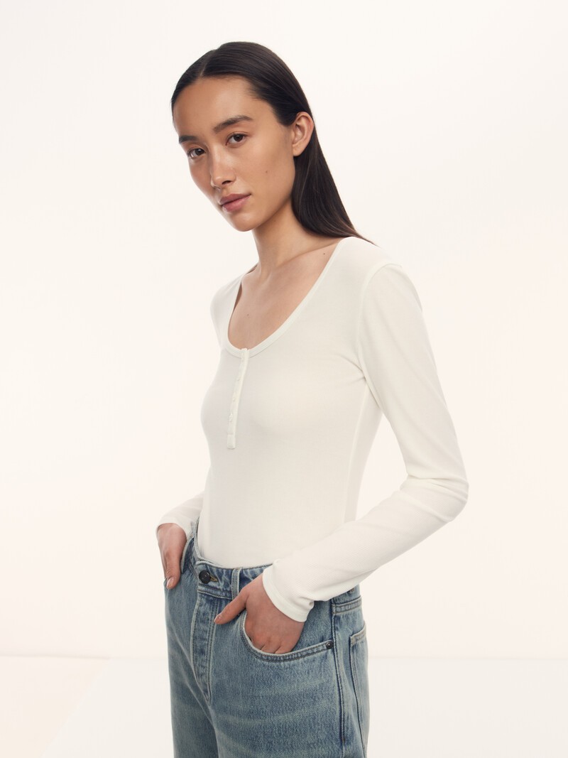 1. Для этого лонгслива мы нашли новый трикотаж: в нем мягкая шерсть и лиоцелл сочетаются с шелком. Такое изделие будет приятно носить весь теплый сезон 2. Легко вписывается в гардероб и отлично подходит к жакетам: благодаря переплетению в рубчик лонгслив комфортно облегает, повторяя линии вашей фигуры 3. Застежка на пуговицы из натурального перламутра Трикотаж может просвечивать — рекомендуем подбирать белье телесного цвета