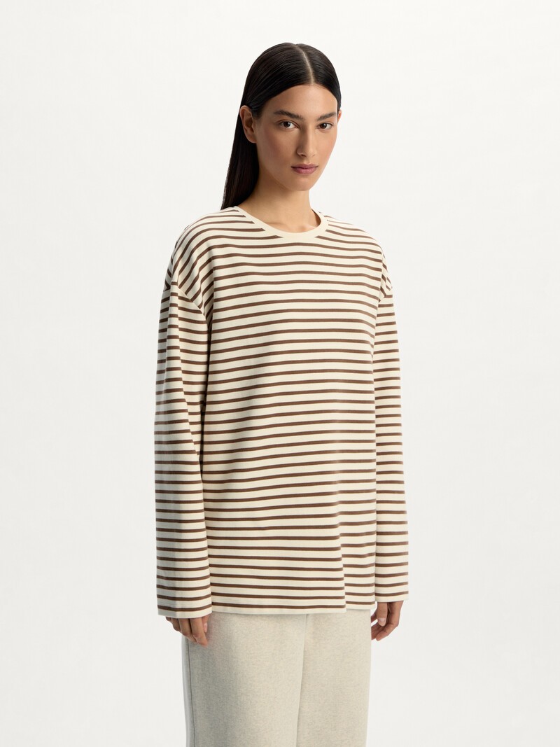 Свободный лонгслив в полоску — одна из самых уютных моделей для повседневного гардероба. Выполнен из хлопка высокого качества, который прочнее и долговечней аналогов. А переплетение интерлок делает материал гладким с обеих сторон и помогает изделию надолго сохранить форму. Сделано в Китае.