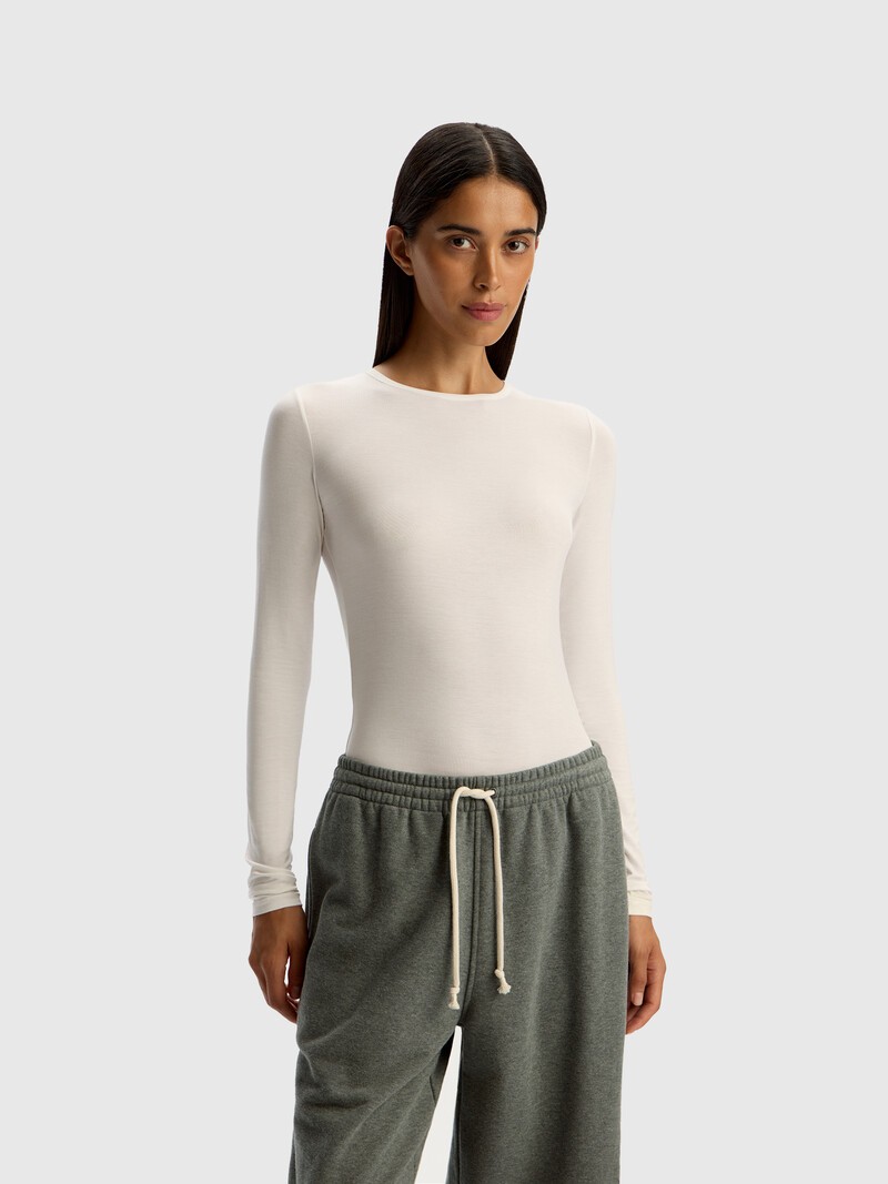 Лонгслив из нежного трикотажа с шелком — классический круглый вырез, длинные узкие рукава, аккуратная посадка по плечам. Его удобно заправить в брюки или юбку и использовать как первый слой: тонкий невесомый материал приятно облегает силуэт, отлично дышит и впитывает влагу. Рекомендуем сочетать с бесшовным бельем.