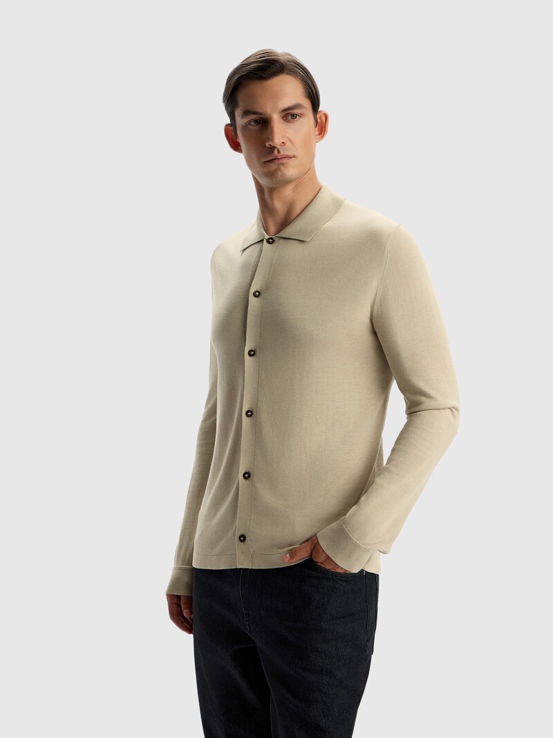 Свободная легкая рубашка из хлопка и шелка, с мягким отложным воротником и застежкой на пуговицы. Связана из гладкой, прохладной к коже пряжи с деликатным матовым блеском — такой трикотаж не только комфортный, но и интересно выглядит. Сочетайте с футболкой из нашей коллекции. Сделано в Китае.