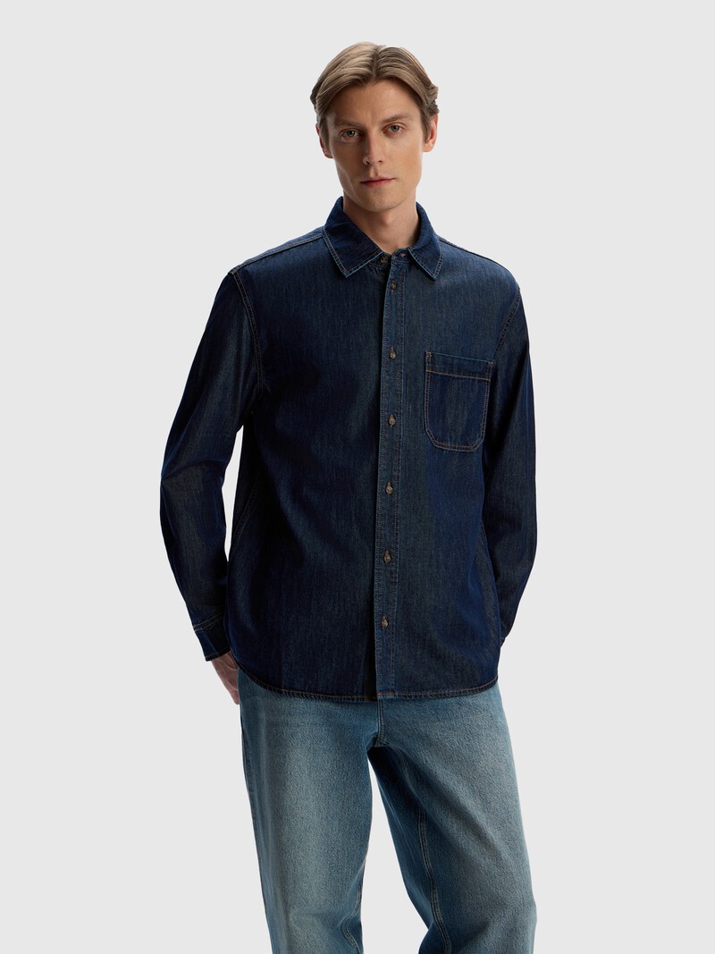 Комфортная и аккуратная рубашка стандартной длины, свободная в плечах и зауженная книзу. Выполнена из тонкого мягкого денима с шелковистой фактурой плотностью 7,2 Oz и окрашена зеленоватым тинтом, заметным в местах потертостей. Пластичный и легкий материал из хлопка и лиоцелла разработан в Италии. Застегивается на пуговицы из натурального перламутра. Лиоцелл — нежное на ощупь волокно из древесины эвкалипта, современная и экологичная альтернатива вискозе. Во время производства не используются токсичные вещества, поэтому вредные выбросы не загрязняют атмосферу. Сделано в Китае.