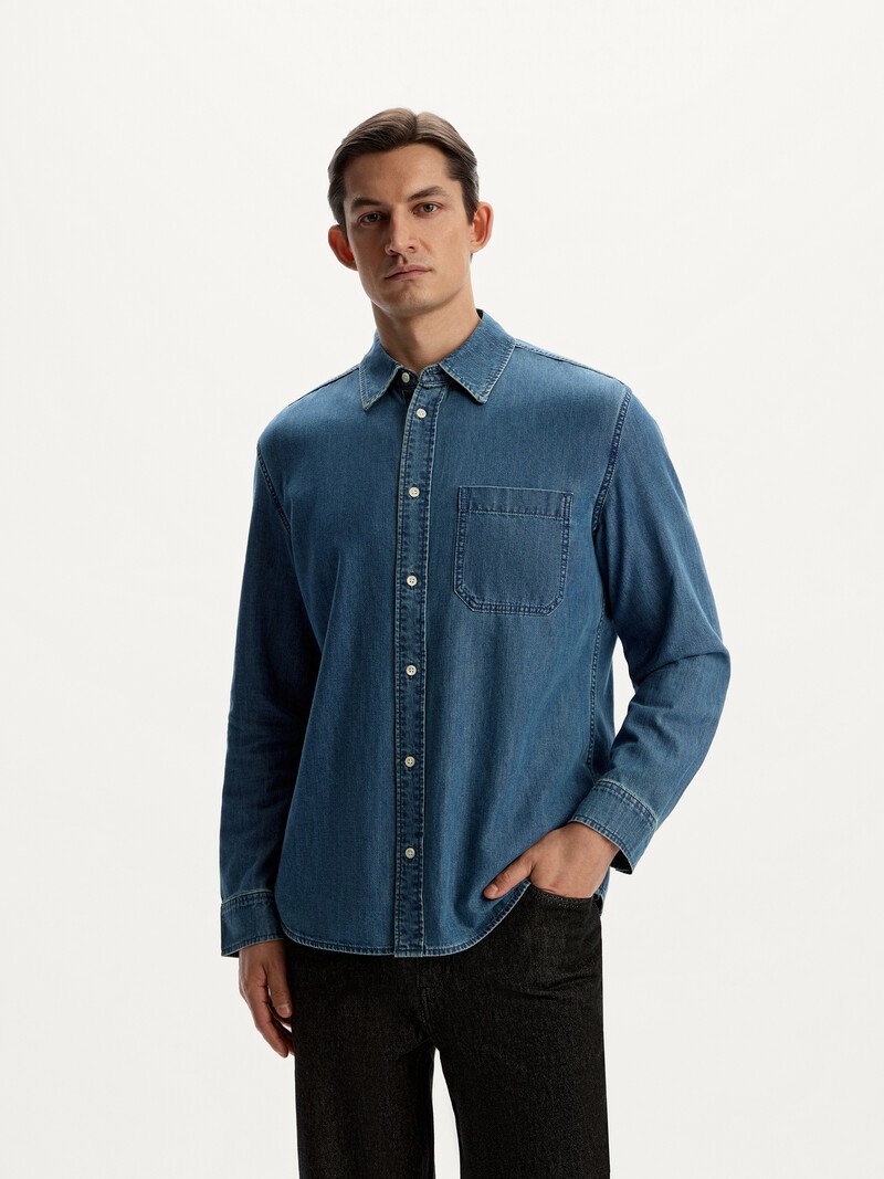 Комфортная и аккуратная рубашка стандартной длины, свободная в плечах и зауженная книзу. Выполнена из тонкого мягкого денима с шелковистой фактурой плотностью 7,2 Oz и окрашена зеленоватым тинтом, заметным в местах потертостей. Пластичный и легкий материал из хлопка и лиоцелла разработан в Италии. Застегивается на пуговицы из натурального перламутра. Лиоцелл — нежное на ощупь волокно из древесины эвкалипта, современная и экологичная альтернатива вискозе. Во время производства не используются токсичные вещества, поэтому вредные выбросы не загрязняют атмосферу. Сделано в Китае.