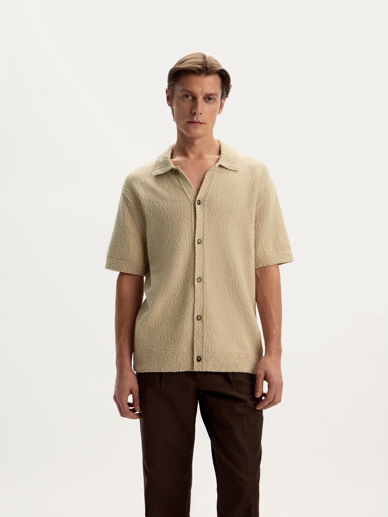 Вязаная рубашка — удобная, не длинная и не слишком широкая. Фактурный хлопковый трикотаж мягкого пшеничного оттенка с небольшими утолщениями и пуговицы под рог придают ей особенно уютный вид. По низу мы добавили резинку для лучшей посадки. Рекомендуем носить нараспашку с футболкой или самостоятельно. Сделано в Китае.