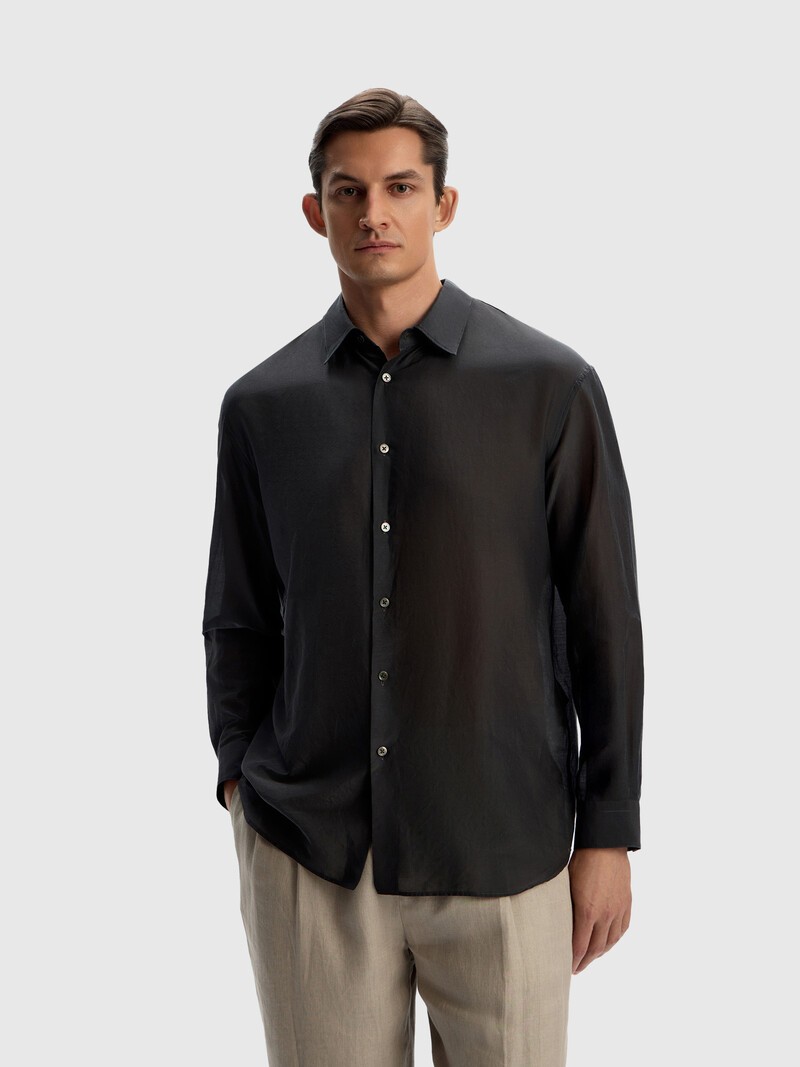 Свободная базовая рубашка из невесомого хлопка с шелком. Полупрозрачная тонкая ткань не раз вас выручит в отпуске или в городскую жару. Застегивается на пуговицы из натуральной ракушки — с ними образ получится еще более летним и легким. Пожалуйста, убедитесь, что рубашка сидит свободно, без натяжения в швах — так она прослужит намного дольше. Сделано в Китае.