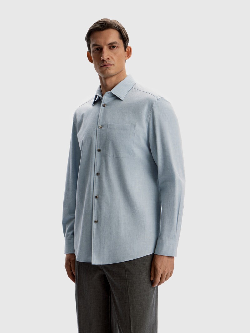 Универсальная прямая рубашка — аккуратная посадка по плечам, округлые манжеты и необычный воротник, который красиво распахивается в расстегнутом виде. Выполнена из тонкой и пластичной хлопковой ткани с уютным меланжевым рисунком и легкой ворсистостью с лицевой стороны. Застегивается на матовые пуговицы из натуральной ракушки. Сделано в Китае.