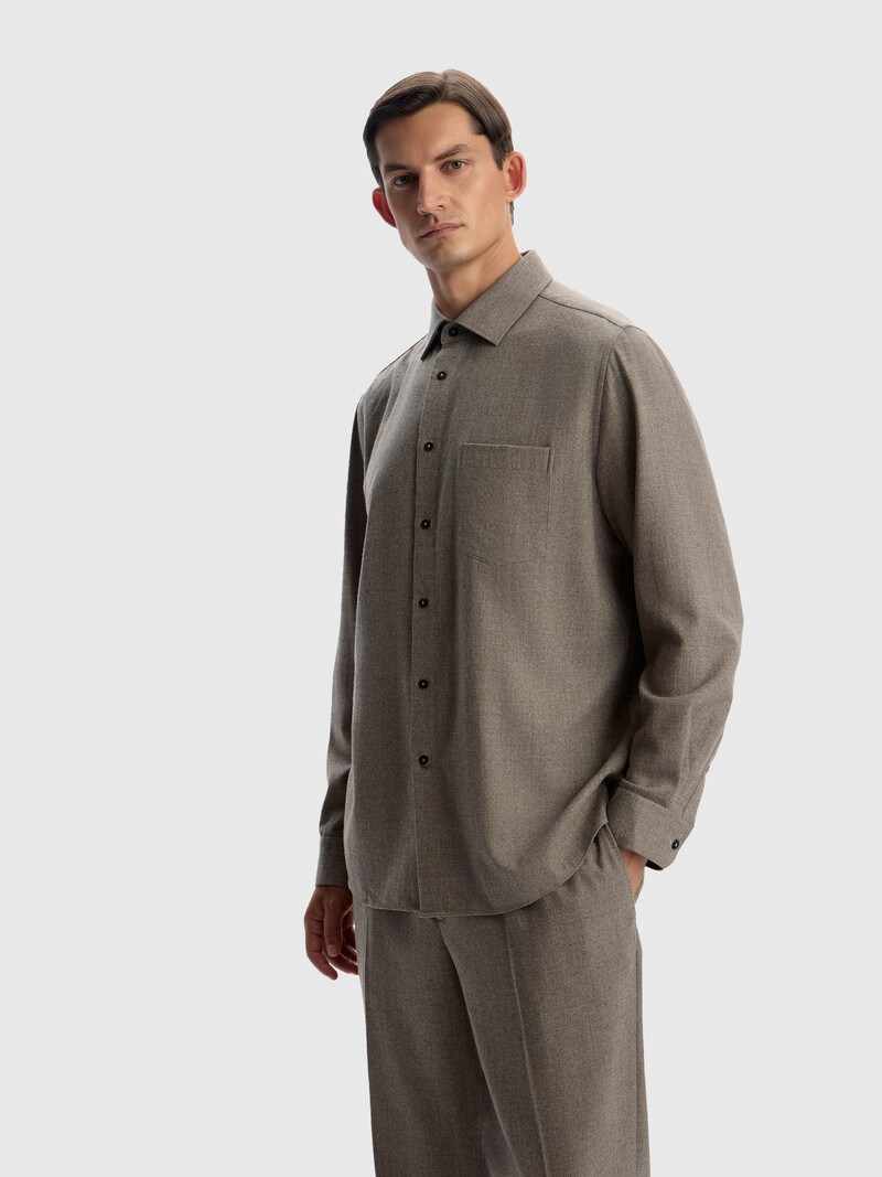 Рубашка из мягкой ворсистой шерсти мериноса. Свободная и теплая, с аккуратным накладным карманом и косточками в воротнике. Такую можно носить как первый слой или надеть поверх футболки. Мы выбрали для нее материал, созданный на итальянской фабрике Drago, которая уже больше 80 лет специализируется на производстве долговечных и тактильно приятных тканей на основе натуральной шерсти. Комбинируйте с брюками из нашей коллекции. Сделано в Китае.