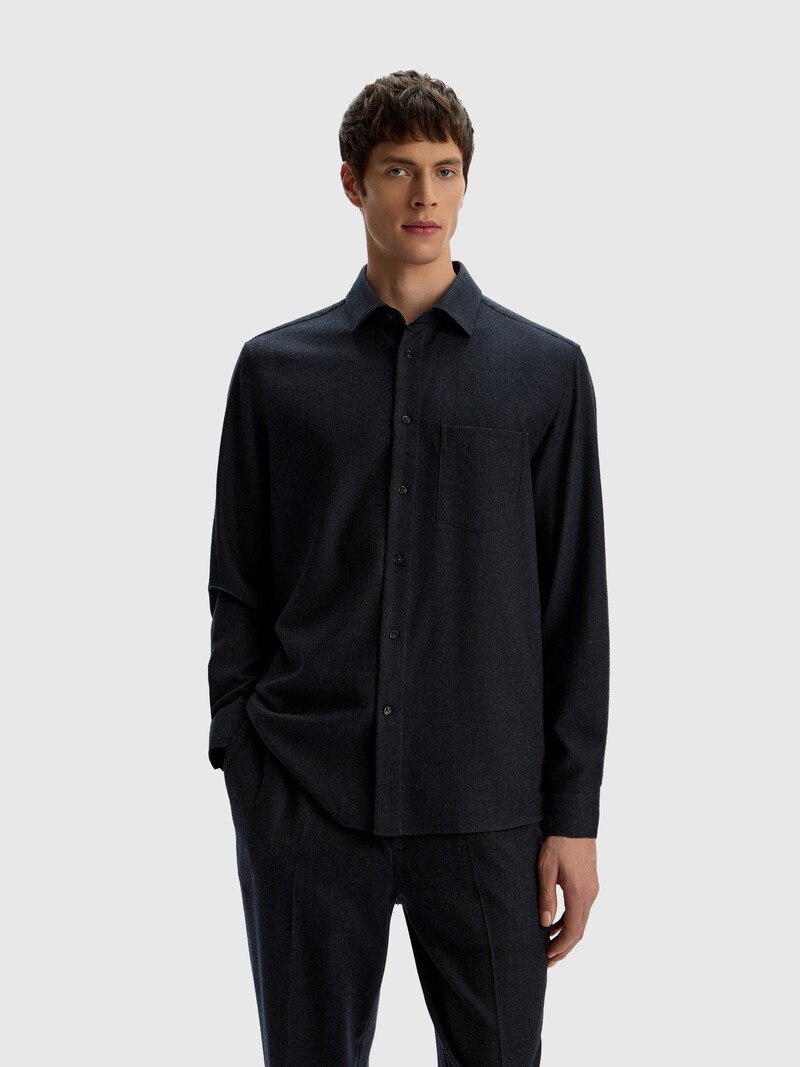 Рубашка из мягкой ворсистой шерсти мериноса. Свободная и теплая, с аккуратным накладным карманом и косточками в воротнике. Такую можно носить как первый слой или надеть поверх футболки. Мы выбрали для нее материал, созданный на итальянской фабрике Drago, которая уже больше 80 лет специализируется на производстве долговечных и тактильно приятных тканей на основе натуральной шерсти. Комбинируйте с брюками из нашей коллекции. Сделано в Китае.