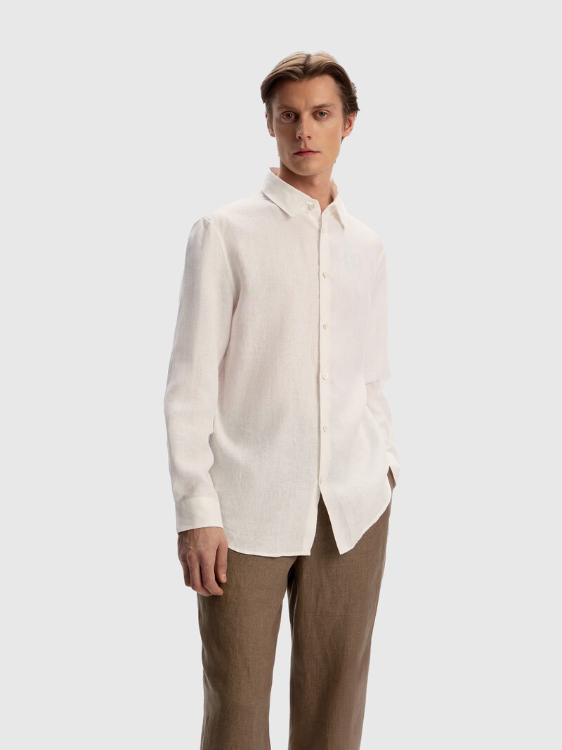 Прямая рубашка из тонкого белого льна — он стал еще более мягким в новом сезоне. Носите ее навыпуск или заправив внутрь — получится по-летнему освежающий образ для теплых дней в городе или прогулок у моря. Застегивается на пуговицы из перламутра. European Flax — сертифицированный европейский лен высшего качества: помогает сократить глобальный углеродный след, безопасен для человека и становится лучше с каждой стиркой. Сделано в Китае.