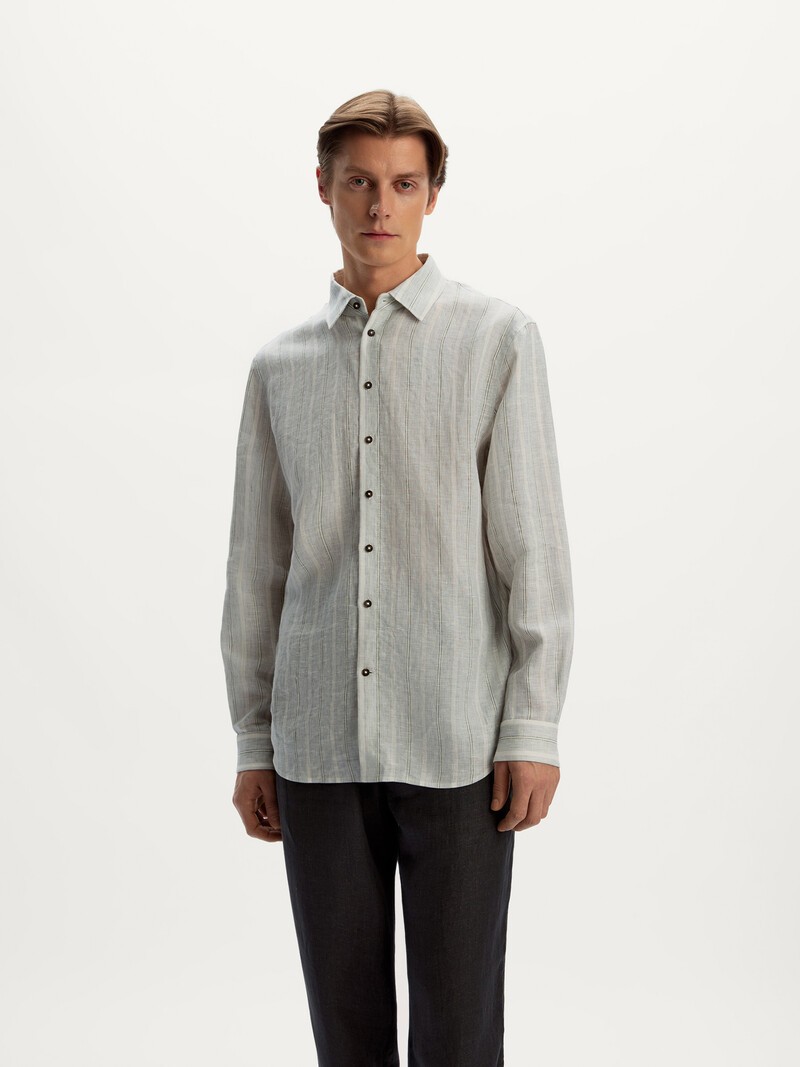 Прямая рубашка из тонкого льна — он стал еще более мягким в этом сезоне. Носите ее вместе с шортами из нашей коллекции, навыпуск или заправив внутрь. Широкая серо-бежевая полоска настроит на отпускной лад и сделает образ расслабленным даже в городе. European Flax — сертифицированный европейский лен высшего качества: помогает сократить глобальный углеродный след, безопасен для человека и становится лучше с каждой стиркой. Сделано в Китае.