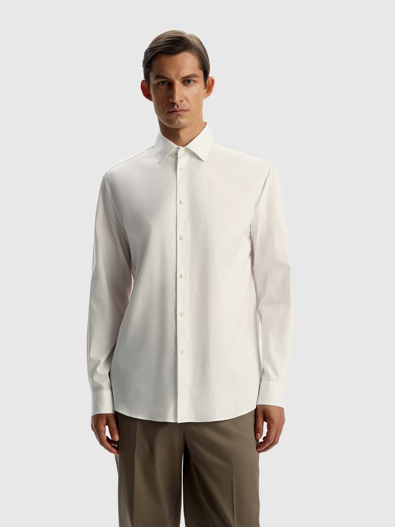 Шесть швов этой рубашки выполнены ручным стежком — как если бы вы заказали ее у неаполитанского мастера, а шов рукава смещен относительно бокового, что придает еще большую свободу движения. В этом сезоне мы доработали материал — тонкий хлопок с шелком теперь имеет специальную обработку, благодаря которой меньше мнется и легче утюжится. Ткань хорошо держит форму и создает приятное ощущение прохлады. Застегивается на пришитые вручную перламутровые пуговицы. Продается в коробке.