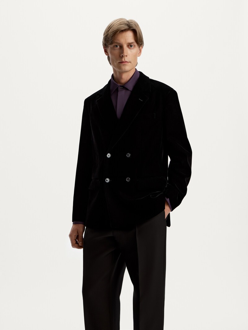 Двубортный пиджак из плотного бархата — для особенно теплых встреч: семейного торжества и праздничных ужинов с коллегами или друзьями. Петля на лацкане вручную вышита шелковой нитью и деликатно поблескивает в движении. Для этой модели мы выбрали тактильно приятный материал с густым, ровным ворсом — он хорошо держит форму и дольше служит. Подкладка глубокого шоколадного цвета из дышащей ткани с добавлением купро оттеняет фактуру бархата, а образу придает еще больший комфорт. Застегивается на пуговицы из перламутра. Сделано в Китае.