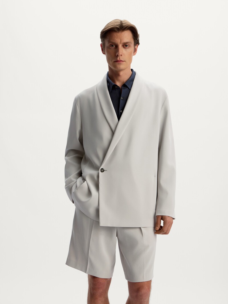 Неформальный пиджак для дней, когда хочется сделать образ особенным. Его силуэт напоминает кимоно, а сзади для удобства движения добавлена шлица. Пиджак выполнен из плотной и пластичной ткани от нашего португальского поставщика — прочный матовый материал дышит, не мнется и хорошо держит форму. Застегивается на пуговицу, продублированную с внутренней стороны. Сделано в Китае.