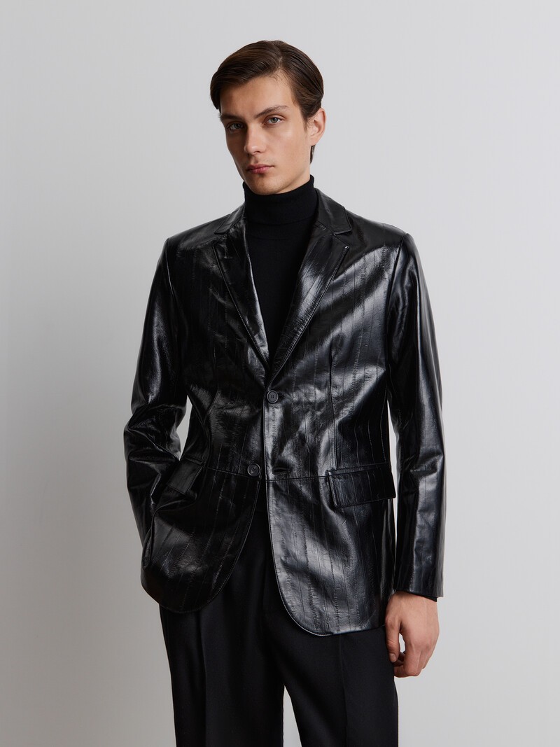 Однобортный приталенный пиджак из блестящей лакированной кожи — для тех случаев, когда важно притягивать взгляды. Натуральный материал с тиснением, напоминающим кожу угря, хорошо держит форму, а шлица сзади позволяет комфортно двигаться. Чтобы сделать образ еще более ярким, пиджак можно носить нараспашку, открывая подкладку насыщенного баклажанового цвета, выполненную из мягкой и тактильно приятной купры. Застегивается на роговые пуговицы с логотипом 12 STOREEZ. Сделано в Турции.