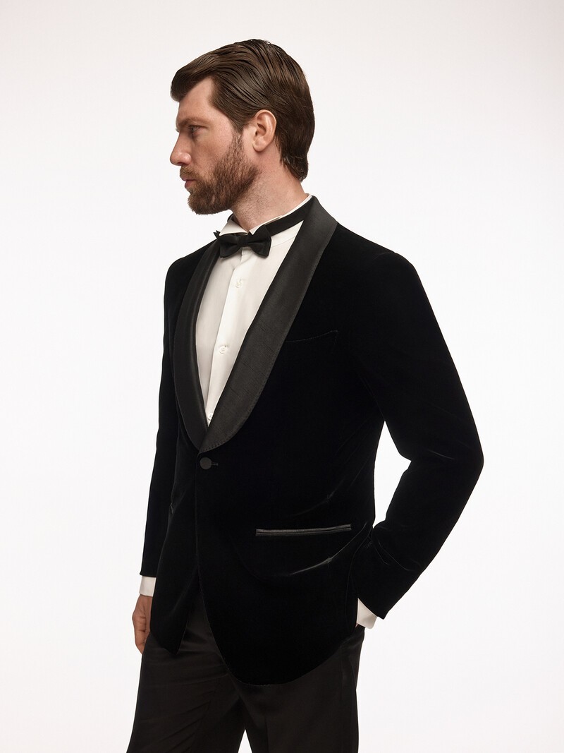 1. Бархат для этого смокинга создан в Японии на фабрике Agehara Velvet, которая производит ткани для Armani, Comme Des Garcons и Prada 2. В основе материала — вискоза и купро, поэтому он мягкий, дышащий и пластичный 3. Прорезной бархат — долговечный: ворс не осыпется и не отклеится после химчисток. Ткань дает глубокие переливы цвета и выразительный блеск в складках 4. Сшит по канонам классического смокинга. Формирует силуэт, визуально расширяет и очерчивает плечи 5. Подстраивается под фигуру владельца благодаря технологии half canvas: между верхней тканью и подкладкой в области груди и плеч проложен слой материала из конского волоса и натуральных волокон 6. Лацканы, пуговица и входы в карманы отделаны диким шелком с матовым блеском 7. Мягкая подкладка из купро. Внутри — два горизонтальных и сигарный карман