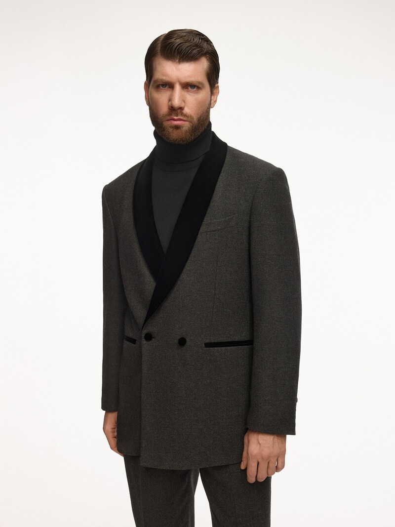 1. Семейная фабрика Drago в Пьемонте производит костюмные ткани на основе шерсти с 1973 и работает с Brioni, Kiton, Hugo Boss и Ermenegildo Zegna 2. Тонкая шерсть мериноса отталкивает влагу и грязь на уровне волокон — капли пролитого напитка легко стереть салфеткой 3. Пиджак вписывается в вечерний дресс-код, но выглядит не так формально, как смокинг 4. Можно носить двумя способами: с поясом или без. Чтобы пояс не смещался, мы сделали незаметные шлевки 5. Лацканы, карманы и пояс с отделкой из японского бархата 6. Благодаря крою формирует силуэт и не сковывает движений