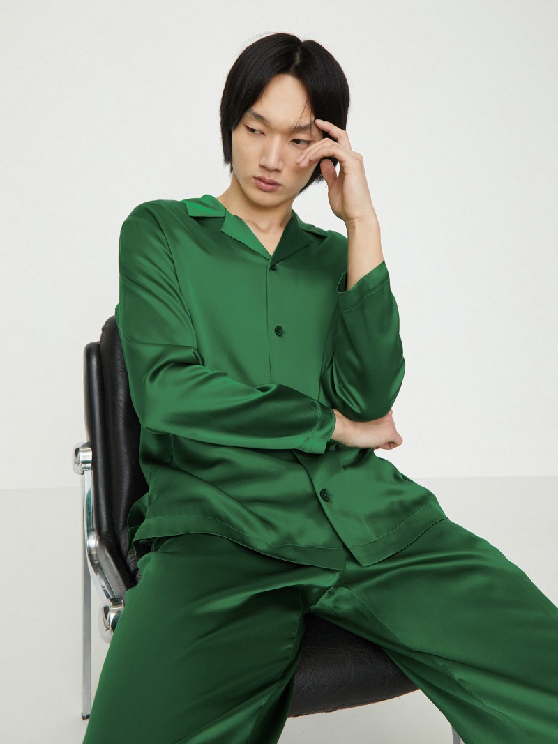 Рубашка из натурального шелка. Свободная рубашка изумрудного оттенка создает праздничное настроение — создайте расслабленный образ с брюками из такого же шелка или более сдержанный с классическими брюками. Для модели выбран натуральный тутовый шелк Mulberry плотностью 22 mm. Сделано в Китае.