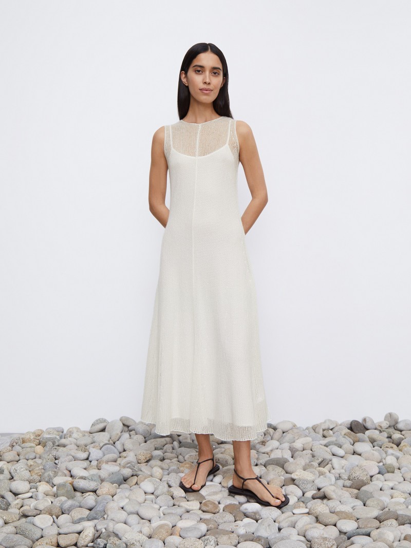 Полупрозрачное платье из тонкого мохера. Вязаное платье в пол из невесомой пушистой нити, дополненное нижним платьем из шелковистой вискозы. Деликатный материал требует бережного обращения: украшения и сумки могут зацепить или порвать тонкую нить. Сделано в Китае.