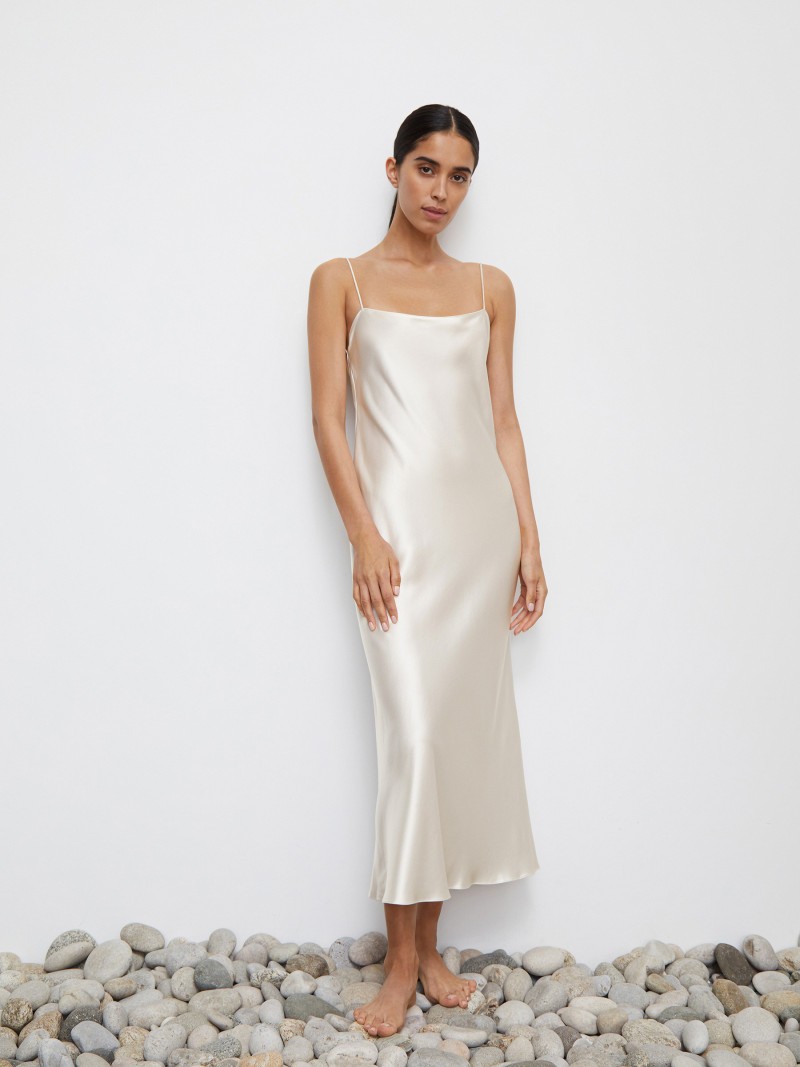 Платье-комбинация из искусственного шелка. Вечернее платье макси с глубоким вырезом на спине и изящными бретелями-руликами. Для модели выбрана плотная и мягкая ткань, которая волнами ниспадает вниз и обладает характерным для шелка блеском. Сделано в России.