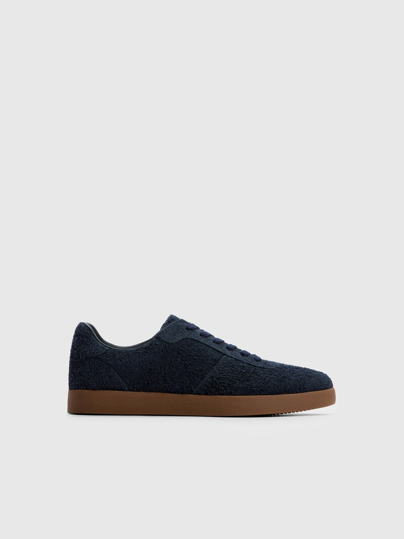 Минималистичные кеды из бархатистой замши глубокого синего оттенка отлично подходят на каждый день. Кожаная стелька с амортизаторами правильно поддерживает стопу, а резиновая подошва делает обувь более долговечной и практичной. На подкладке из текстиля. Вес пары в 42 размере: 0,80 кг Сделано в Китае.