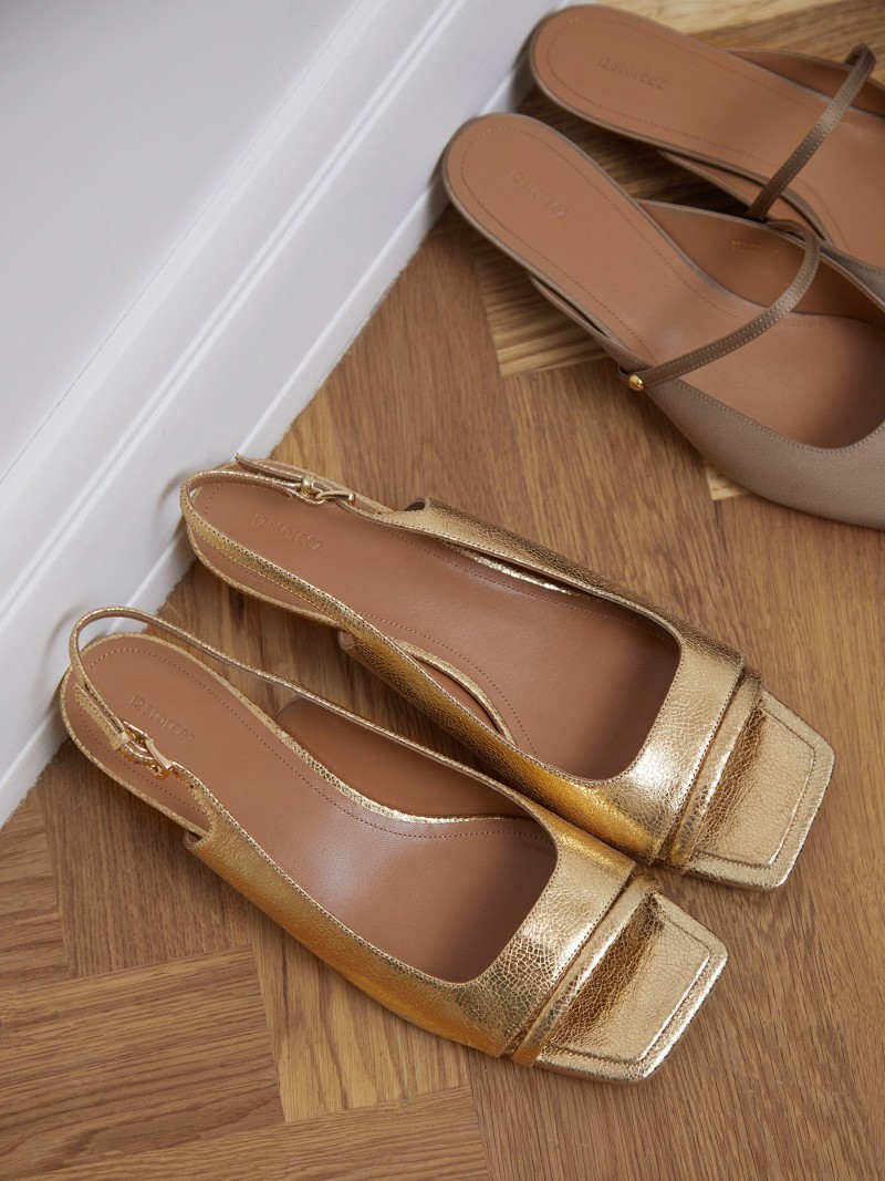 Сияющие босоножки из натуральной кожи с эффектом кракле. Двойная перемычка на пальцах придает модели утонченность, а ремешок с позолоченной пряжкой надежно фиксирует обувь на стопе. Миниатюрный каблук киттен хил и кожаная стелька с мягкой подушечкой под пальцами обеспечивают комфорт и устойчивость. - От кончиков пальцев до края подошвы должно оставаться примерно 0,5 см. Пожалуйста, учитывайте это при выборе размера. - Каблук обтянут кожей и требует бережного обращения — острые камни и другие предметы могут оставить на коже царапины и порезы. Сделано в Китае.