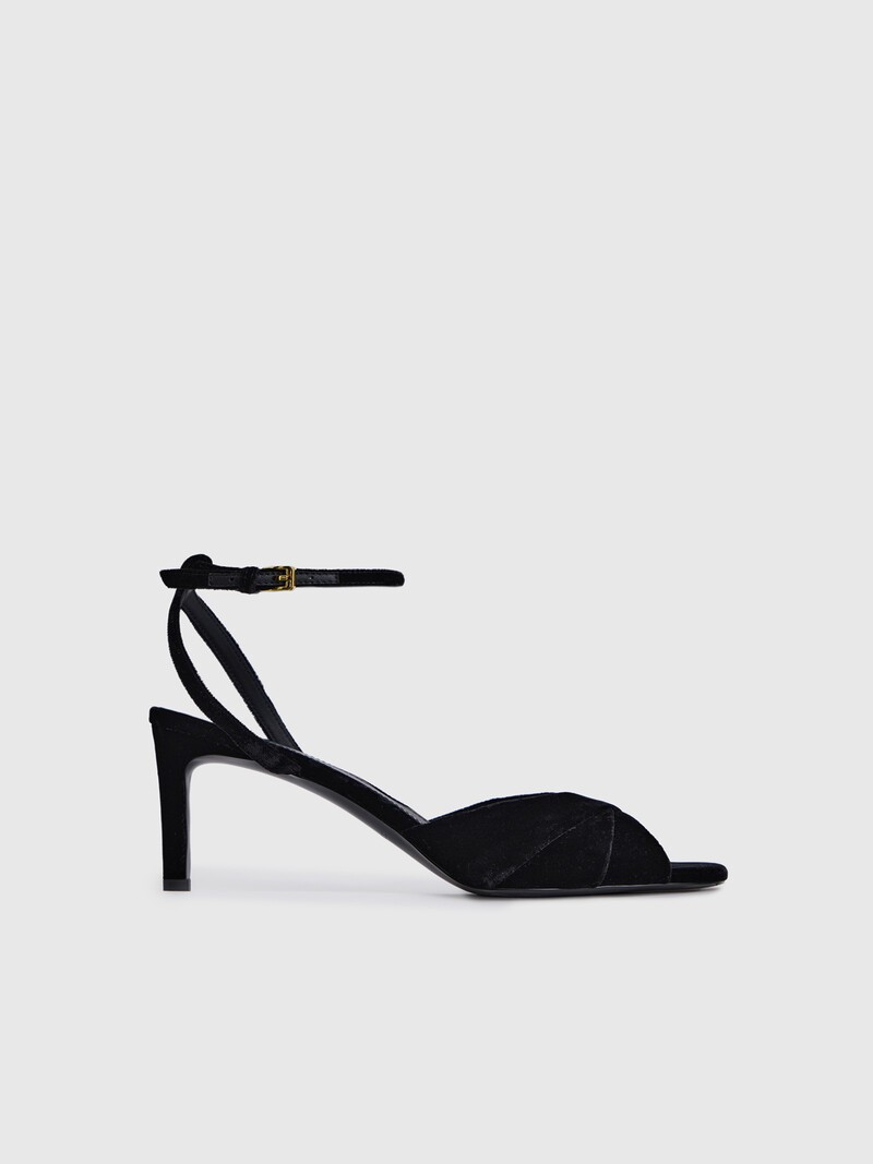1. Анатомически верная колодка, благодаря которой каблук высотой 8 см не ощущается и нога не устает 2. Чтобы бархатный ремешок не растягивался, мы продублировали его тонкой кожей шевро. Из такой же кожи сделали подкладку и стельку 3. Не скользят по гладкому полу — легкую подошву из тунита дополнили инжекцией Каблук обтянут бархатом — обращайтесь с ним аккуратно.
