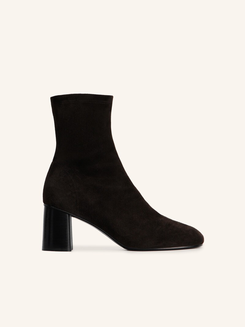 Комфортные ботильоны из эластичного велюра — скругленный нос, устойчивый широкий каблук высотой 7 см и голенище, которое мягко облегает ногу. На уровне стопы мы предусмотрели подкладку из плотной кожи — она придает ботильонам форму — а стельку сделали из кожи коровы. Застегиваются на молнию. Вес пары в 37 размере: 0,65 кг.
