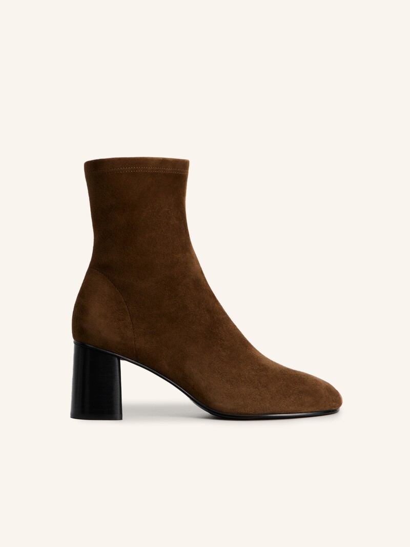 Комфортные ботильоны из эластичного велюра — скругленный нос, устойчивый широкий каблук высотой 7 см и голенище, которое мягко облегает ногу. На уровне стопы мы предусмотрели подкладку из плотной кожи — она придает ботильонам форму — а стельку сделали из кожи коровы. Застегиваются на молнию. Вес пары в 37 размере: 0,65 кг.