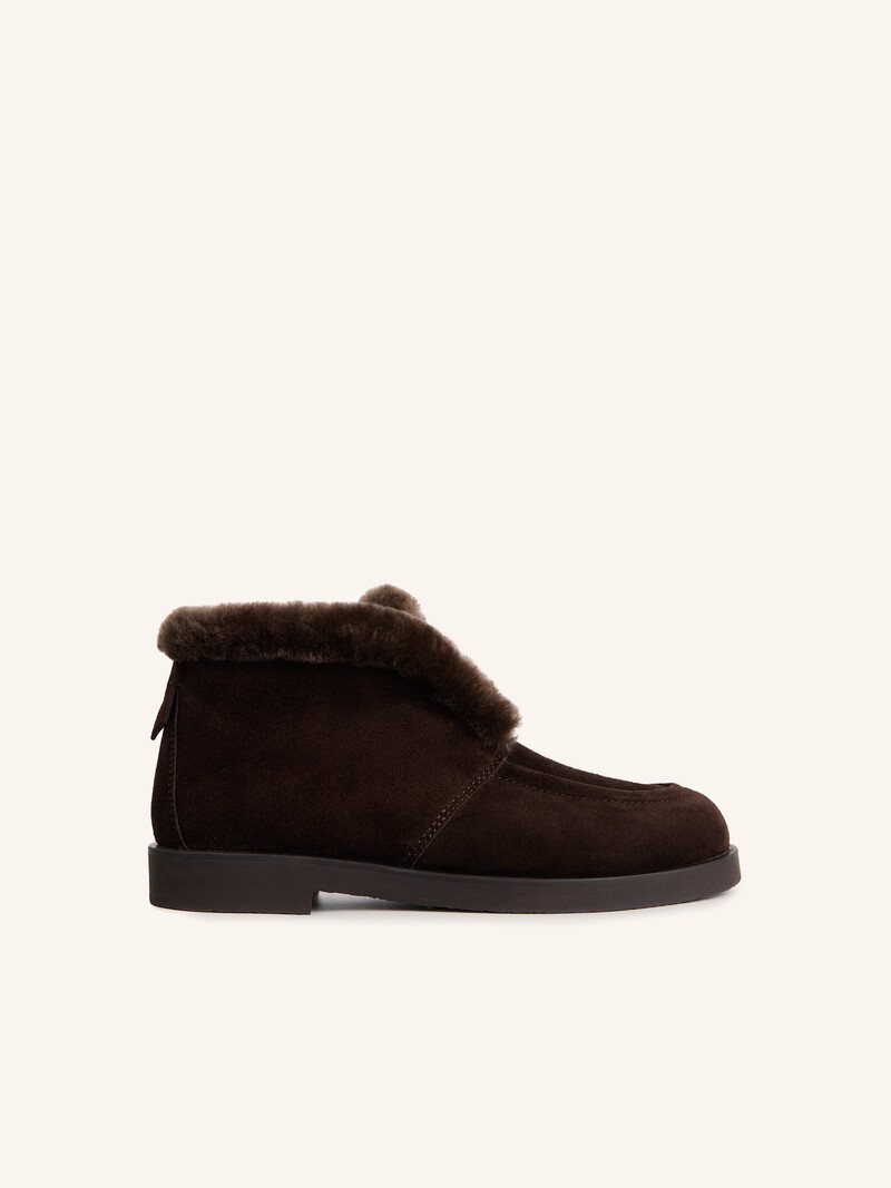 1. Согреют до -10 °C: снаружи плотная коровья замша, а внутри — густой овечий мех 2. Комфортно садятся: удобный широкий носок и внутренняя резинка, благодаря которой ботинки плотно обнимают ногу 3. Устойчивые и долговечные — подошву мы сделали из нескользящей резины с широким каблуком 4. Декоративный объемный шов делает ботинки изящными и аккуратными Деликатный материал требует бережного обращения. После покупки обработайте обувь влагоотталкивающим средством.