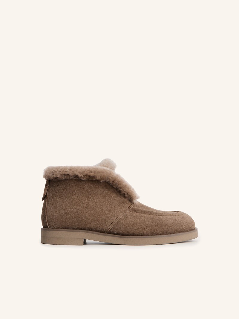 1. Согреют до -10 °C: снаружи плотная коровья замша, а внутри — густой овечий мех 2. Комфортно садятся: удобный широкий носок и внутренняя резинка, благодаря которой ботинки плотно обнимают ногу 3. Устойчивые и долговечные — подошву мы сделали из нескользящей резины с широким каблуком 4. Декоративный объемный шов делает ботинки изящными и аккуратными Деликатный материал требует бережного обращения. После покупки обработайте обувь влагоотталкивающим средством.