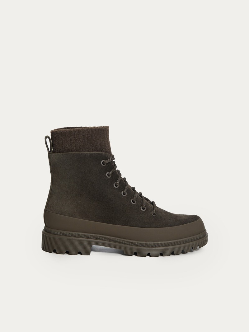 Ботинки из плотной, мягкой и бархатистой замши незаменимы в ненастные дни — они не скользят благодаря глубокому протектору и отлично греют. Мы дополнили их носком из вязаного трикотажа и добавили прорезиненную деталь для защиты подошвы от грязи и пыли. В модели нет контрастных деталей, а значит, ее легко сочетать практически с любыми предметами сезонного гардероба. Сделано в Китае.