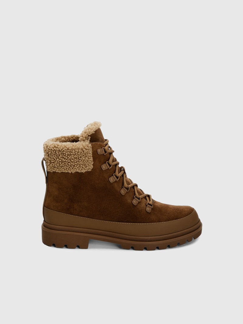 Новинка — высокие зимние ботинки из плотной бархатистой замши с теплым овечьим мехом внутри. Высокая резиновая подошва поможет сохранить тепло, а глубокий протектор не позволит обуви скользить. Меховую стельку при необходимости можно вынуть, а прорезиненная деталь защитит ботинок от влаги. Деликатный материал требует бережного обращения. После покупки обработайте обувь влагоотталкивающим средством. Сделано в Китае.
