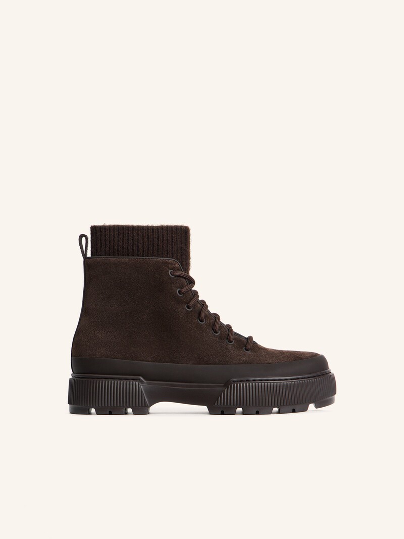 Высокие замшевые ботинки защитят вас от зимней слякоти и грязи. Подкладка из ворсистой шерсти и трикотажный носок берегут тепло, а широкий кант из прорезиненной кожи над подошвой отталкивает влагу. Высокую подошву с протектором мы сделали из EVA — так она получилась устойчивой и легкой, несмотря на толщину. Вес пары в 37 размере: 0,78 кг.