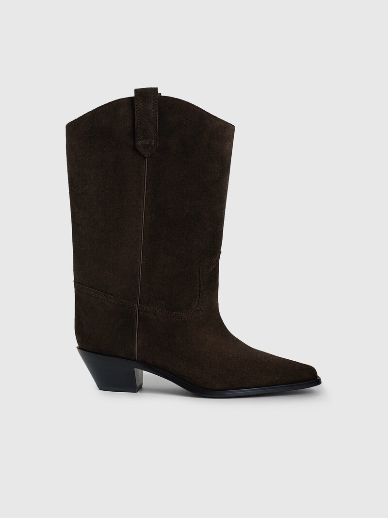 Высокие казаки из плотной и мягкой замши станут любимой парой в ненастные дни. Голенище достаточно широкое, чтобы заправить в казаки брюки или джинсы. Резиновая защита делает изящную подошву из тунита более долговечной и нескользкой, а классический скошенный каблук обтянут устойчивым к царапинам шпальтом. Вес пары в 37 размере: 1,14 кг. Сделано в Китае.