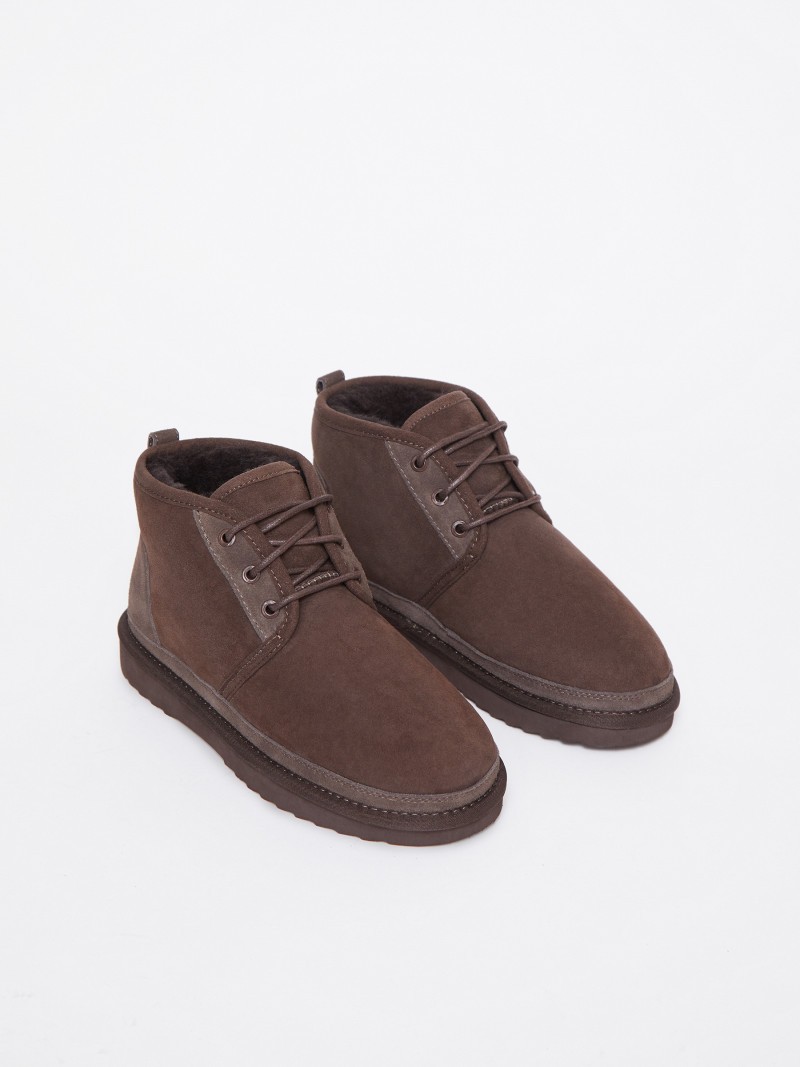 Ботинки даблфейс. Уютные ботинки для долгих прогулок в морозные дни: верх выполнен из мягкой бархатистой замши, а внутри — густая овчина. Ботинки облегают ногу, как теплые носки, а вставка из плотной замши помогает обуви держать форму. Легкая подошва из пористого материала приподнимает стопу над холодной землей. - Полноразмерные, стандартная полнота - После покупки рекомендуем обработать влагоотталкивающим средством - При частом ношении подошва может спрессовываться, но затем восстанавливает форму Сделано в Китае.