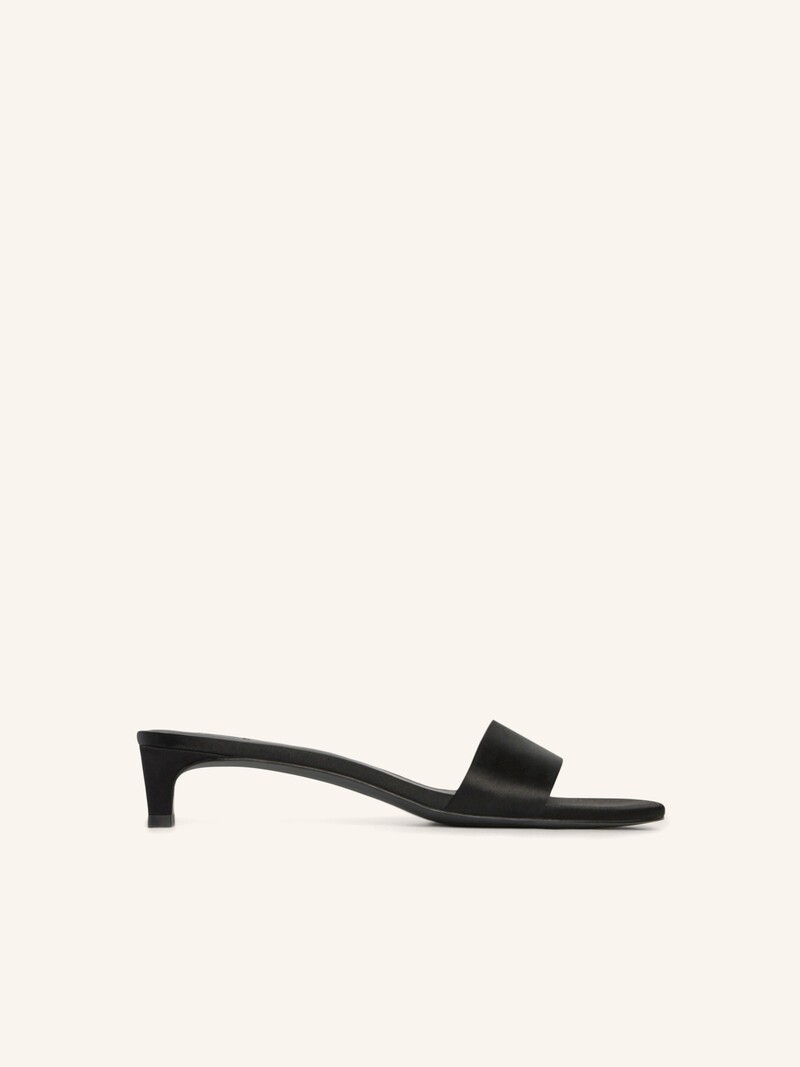 Изящные мюли из шелкового сатина с еле уловимым блеском — универсальные и удобные. Их лаконичные линии помогут создать женственный образ для лета, а в холодный сезон вы сможете стилизовать эту обувь для важных мероприятий. Подкладка выполнена из тонкой кожи шевро, а стелька — из долговечной микрофибры, чтобы вы могли носить мюли на голую ногу. Пожалуйста, обращайтесь с каблуком аккуратно: острые камни или песок могут оставить на шелке царапины и порезы. Вес пары в 37 размере: 0,39 кг. Высота каблука: 4 см.