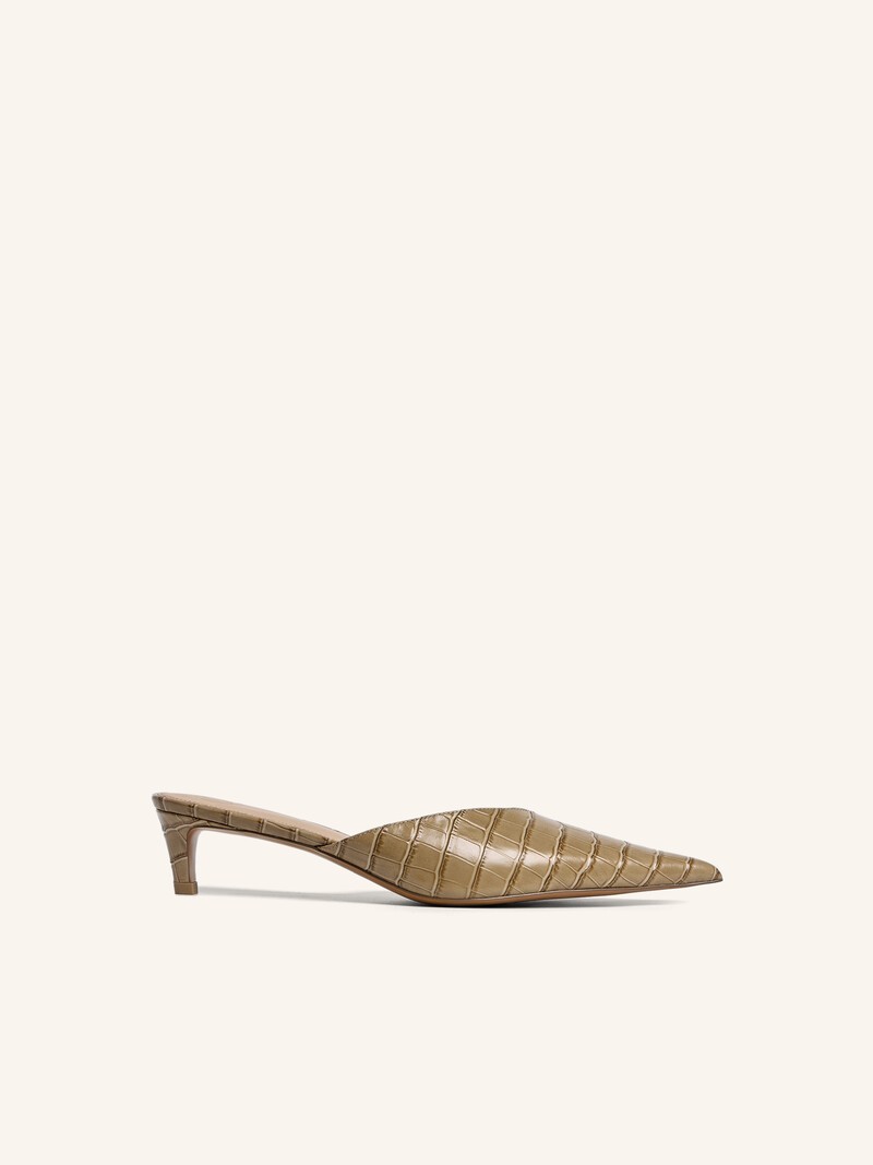 Изящные остроносые мюли для расслабленных женственных образов — особенно в дни, когда не предвидится спешки. Выполнены из гладкой матовой кожи коровы с тиснением под крокодила и дополнены подкладкой из натуральной кожи шевро светло-бежевого цвета. Бесшумная резиновая набойка придает обуви устойчивость, а тунитовая подошва с инжекцией защищает от скольжения. Мы сделали стельку из нежной и практичной микрофибры — а значит, мюли будет комфортно носить на голую ногу. Пожалуйста, обращайтесь с каблуком аккуратно — острые камни или песок могут оставить на коже царапины и порезы. Вес пары в 37 размере: 0,38 кг. Высота каблука: 4 см.