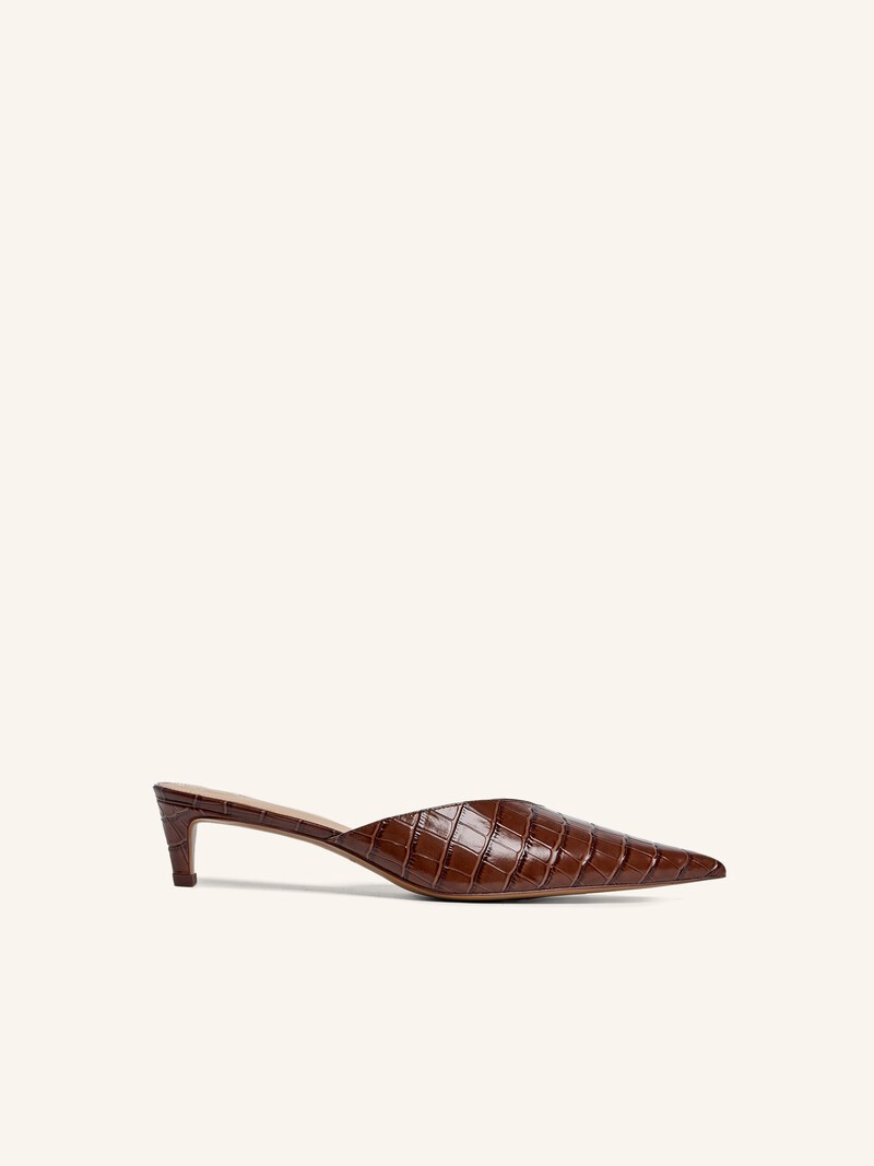 Изящные остроносые мюли для расслабленных женственных образов — особенно в дни, когда не предвидится спешки. Выполнены из гладкой матовой кожи коровы с тиснением под крокодила и дополнены подкладкой из натуральной кожи шевро светло-бежевого цвета. Бесшумная резиновая набойка придает обуви устойчивость, а тунитовая подошва с инжекцией защищает от скольжения. Мы сделали стельку из нежной и практичной микрофибры — а значит, мюли будет комфортно носить на голую ногу. Пожалуйста, обращайтесь с каблуком аккуратно — острые камни или песок могут оставить на коже царапины и порезы. Вес пары в 37 размере: 0,38 кг. Высота каблука: 4 см.