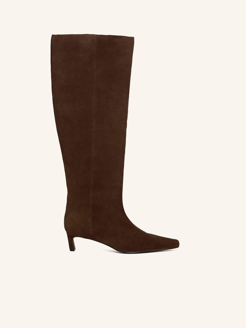Классические сапоги-трубы без застежки на изящном каблуке 4 см — для элегантных образов с платьями и юбками. Выполнены из бархатистой плотной замши, согревающей и мягкой, а тунитовая подошва дополнена защитой от скольжения. Деликатный материал требует бережного обращения. После покупки обязательно обработайте обувь влагоотталкивающим средством. Старайтесь носить сапоги аккуратно: каблук модели обтянут замшей и может поцарапаться об острые камни или брусчатку.