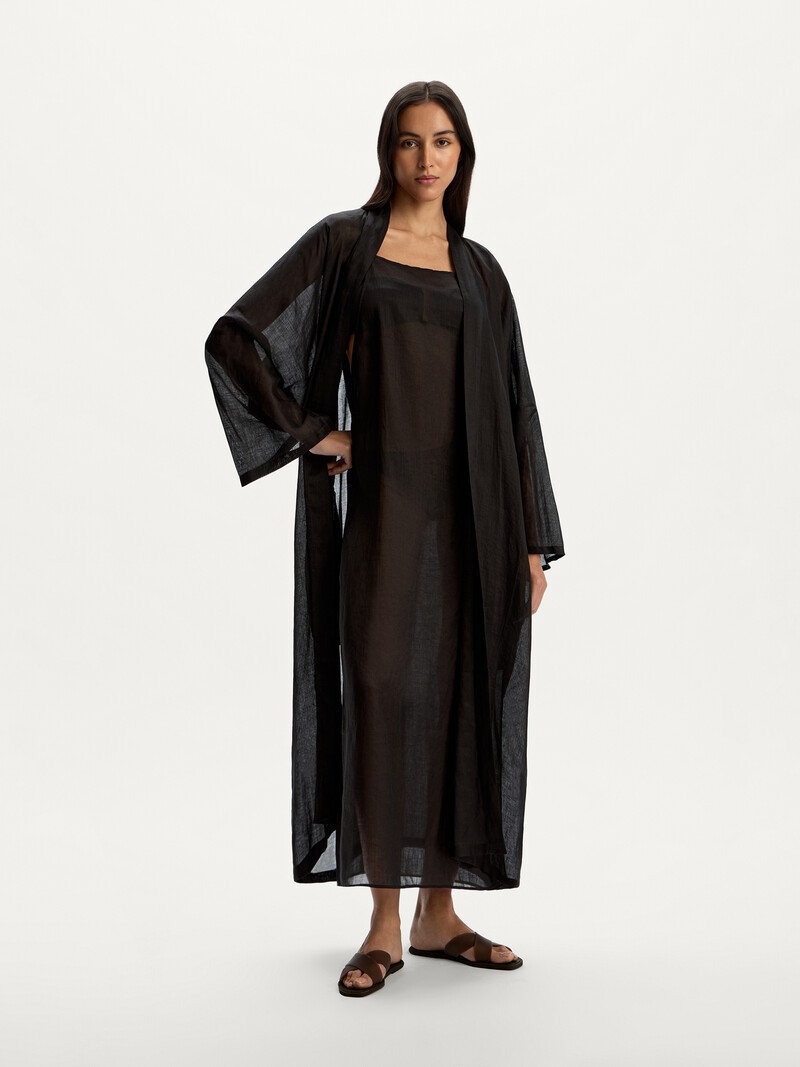 Объемный длинный халат с карманами и поясом — альтернатива пляжному платью или тунике. Выполнен из невесомого и полупрозрачного материала, по своим свойствам похожего на лен. Широкие рукава и отсутствие застежки придают ему сходство с кимоно и создают расслабленный образ. Рами — экологически чистая ткань из волокон крапивы. Для ее производства не нужны гербициды и пестициды и расходуется намного меньше воды. Сделано в Китае.