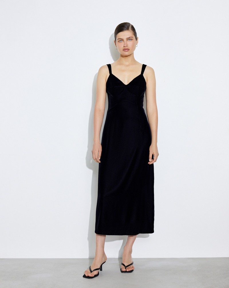 Платье из тонкого бархата. Прилегающий силуэт, лиф в виде бюстье и глубокое декольте. Застежка на потайную молнию и немного завышенная линия талии. Сделано в России.