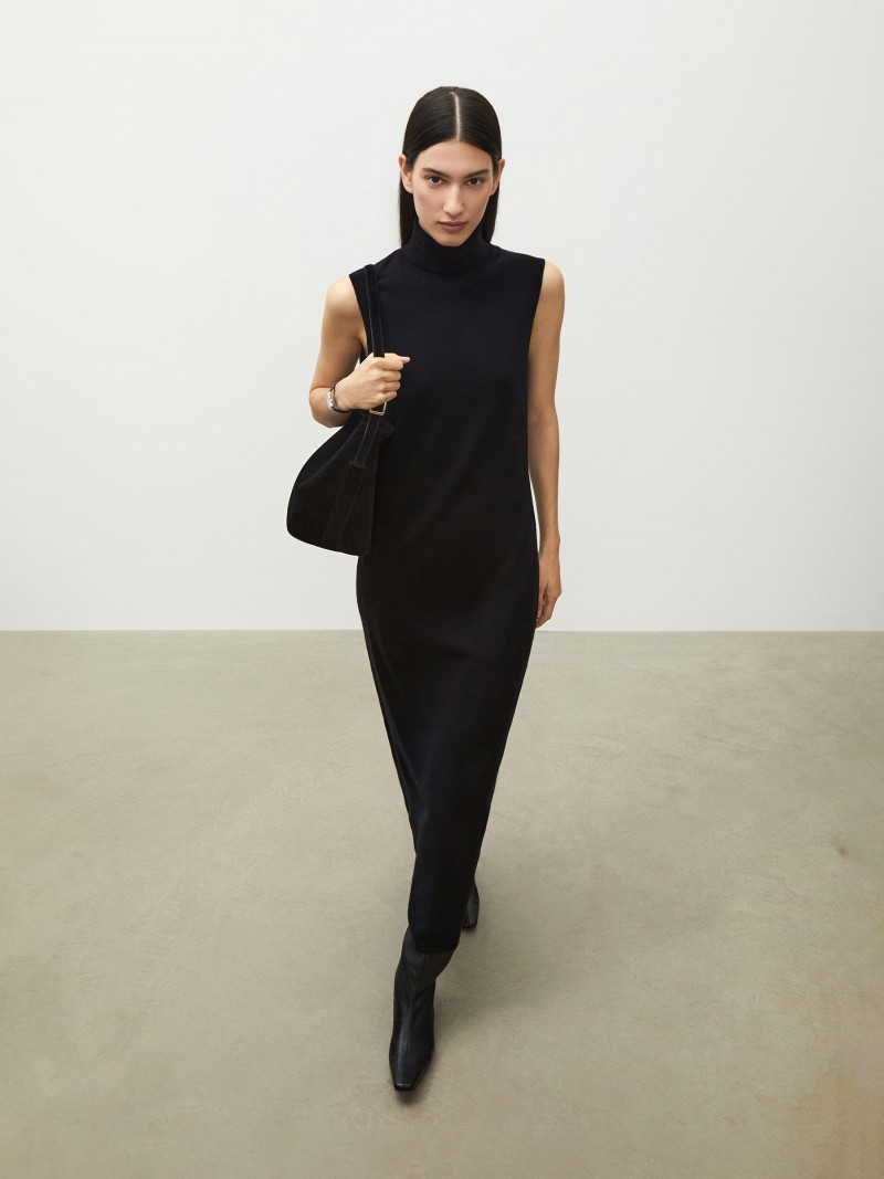 Это длинное платье с воротником-стойкой, полуприлегающее и расширенное книзу, отлично сочетается с жакетом, рубашкой и даже джинсовкой. Мягкий, тонкий и теплый трикотаж не просвечивает, однако рекомендуем выбрать бесшовное белье. Носите в сухую погоду, чтобы не испачкать подол, а для удаления пиллей пользуйтесь специальной машинкой. Сделано в Китае.